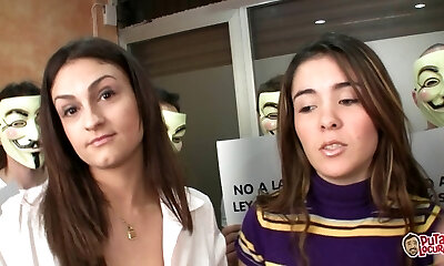 Whorish dark-haired with quite nice fun bags gets mouthfucked by lots of studs