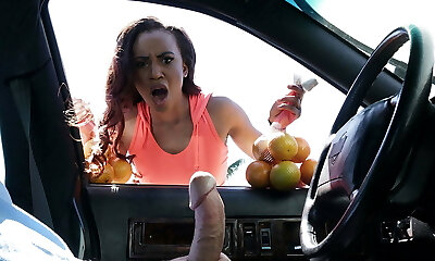 Nasty brunette teen bangs ginormous cock in car